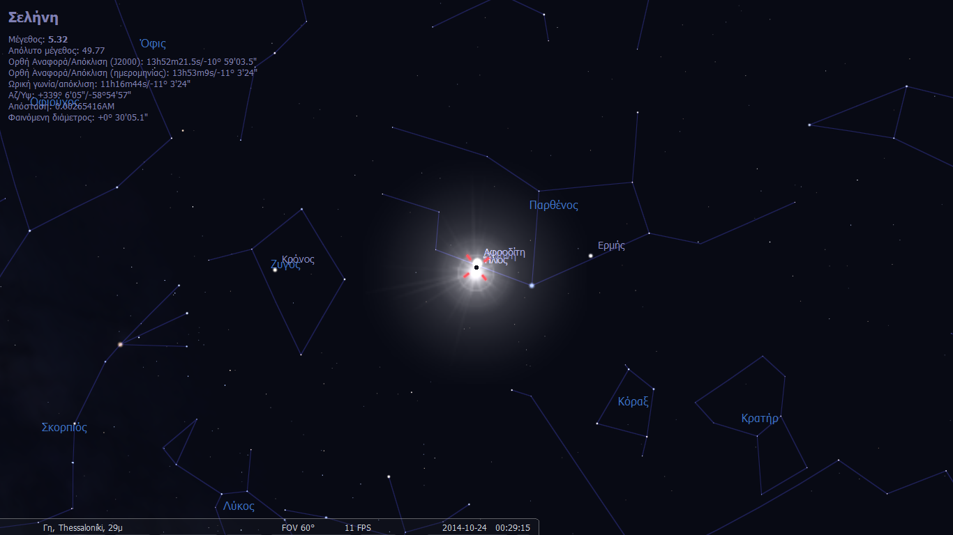 Βλέπουμε στην εικόνα του προγραμματιστή stellarium την ώρα της έκλειψης Ηλίου, με την Σελήνη, η μαύρη κουκκίδα, μπροστά στον Ήλιο. Την μέρα αυτή η Αφροδίτη θα βρίσκεται πίσω από τον ήλιο κι ο Ερμής στα δεξιά του. Όλα αυτά στον αστερισμό της Παρθένου ! Επίσης θα φαίνεται και ο Κρόνος, αριστερά του Ήλιου, γι` αυτούς που βλέπουν την έκλειψη....
